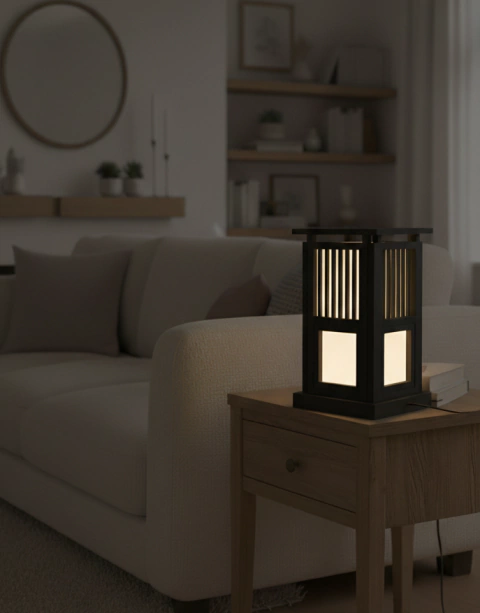 La lámpara Zenji está inspirada en las tradicionales linternas japonesas Andon, diseñadas para iluminar caminos y crear espacios de serenidad. Su estructura de listones verticales y paneles difusores genera un cautivador juego de luces y sombras, aportando equilibrio y una atmósfera de paz a cualquier rincón.
